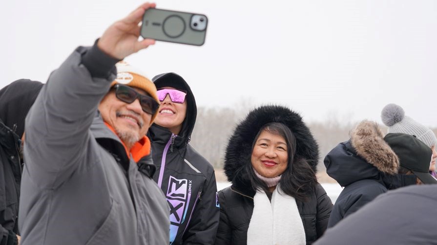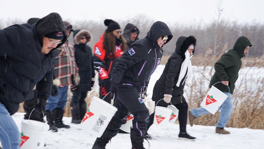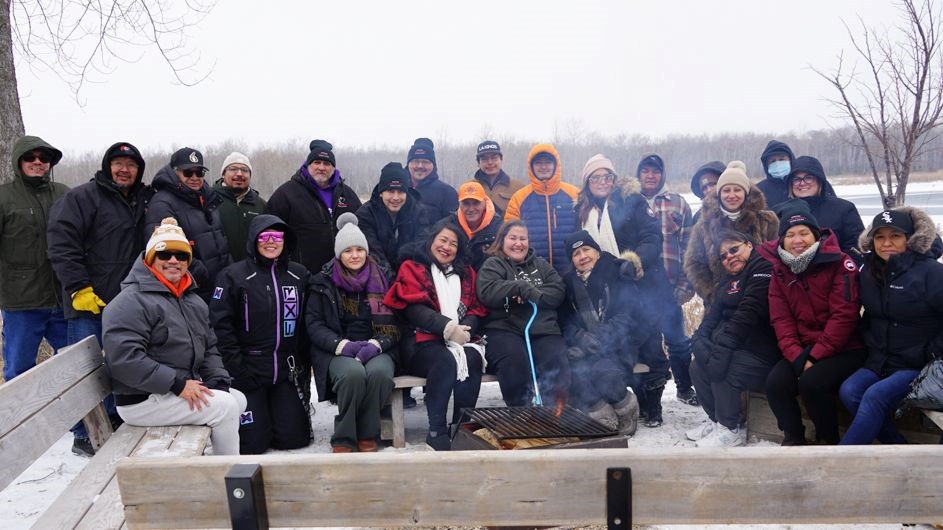 Aki As Teacher continued this December 4 with indigenous games at the Fort Whyte Alive Siohban Richardson Station. This session invited language and land-based teachers to learn about indigenous games with Elder Norbert Mercredi and learn Cree stories with Elder Richard Keeper. Elder Norbert guided teachers through stretching and warmups before diving into game demonstrations. Teachers followed his lead in taking games indoors and outdoors. On the snowy day, they braved flurries and cold wind to enjoy learning games like lacrosse, where they tossed a ball back and forth with handmade original lacrosse sticks under the guidance of the Elder. Elder Richard Keeper closed the professional development session with Cree stories, oral stories of creation.